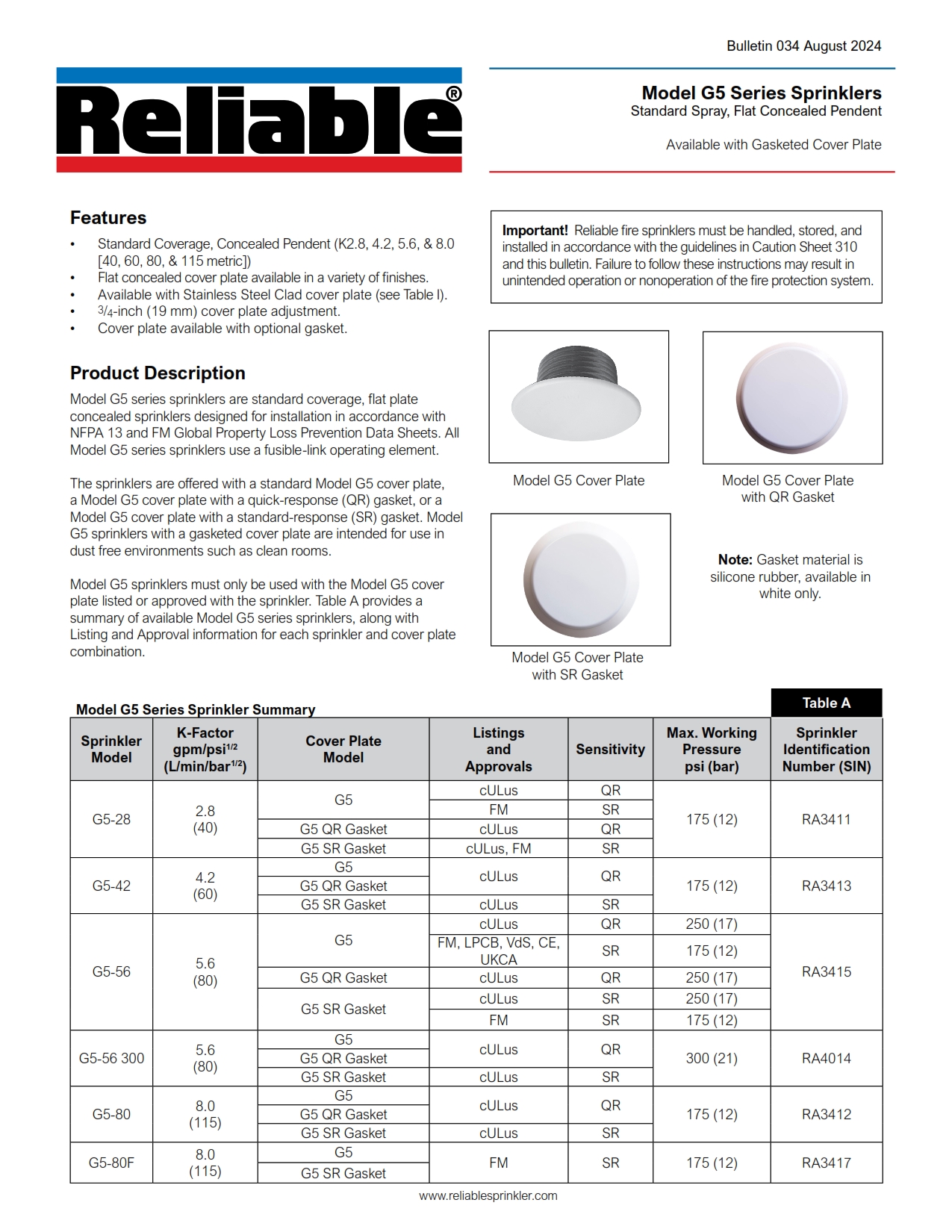 REILABLE CONCEALED PENDENT SPRINKLER STANDARD AND QUICK RESPONSE