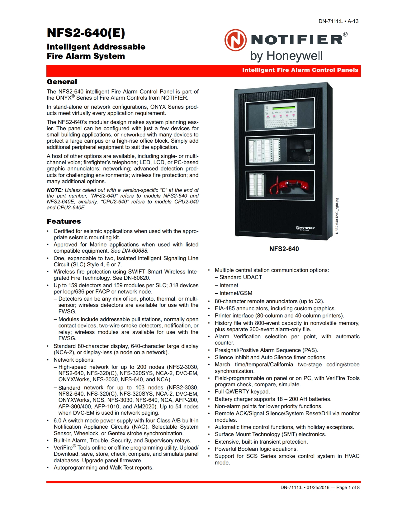 The NFS2-640 intelligent fire alarm control panel is part of NOTIFIER's UL listed ONYX Series. It's designed specifically for mid-size applications, and easily expanded via NOTIFIER's intelligent fire alarm network.