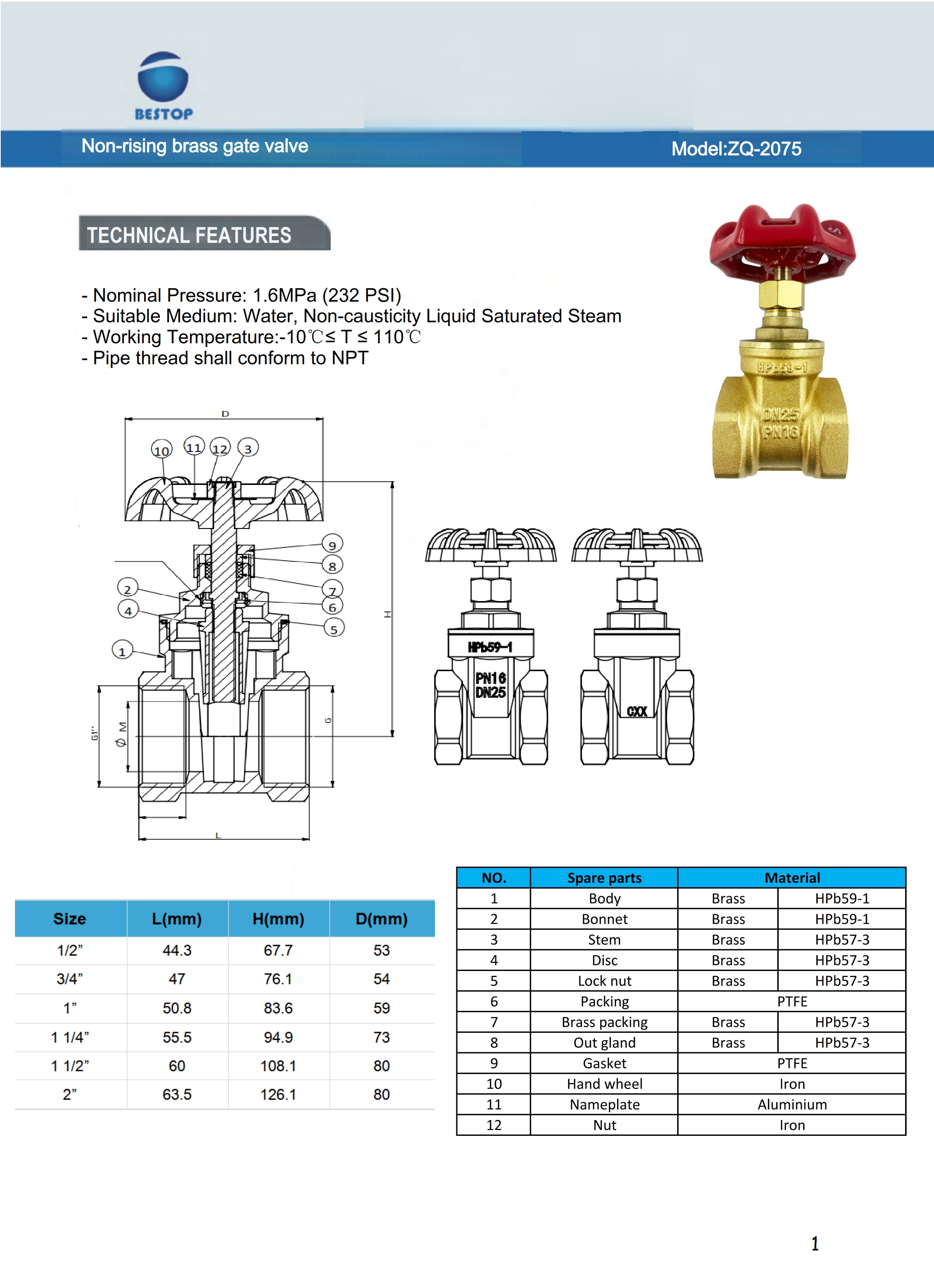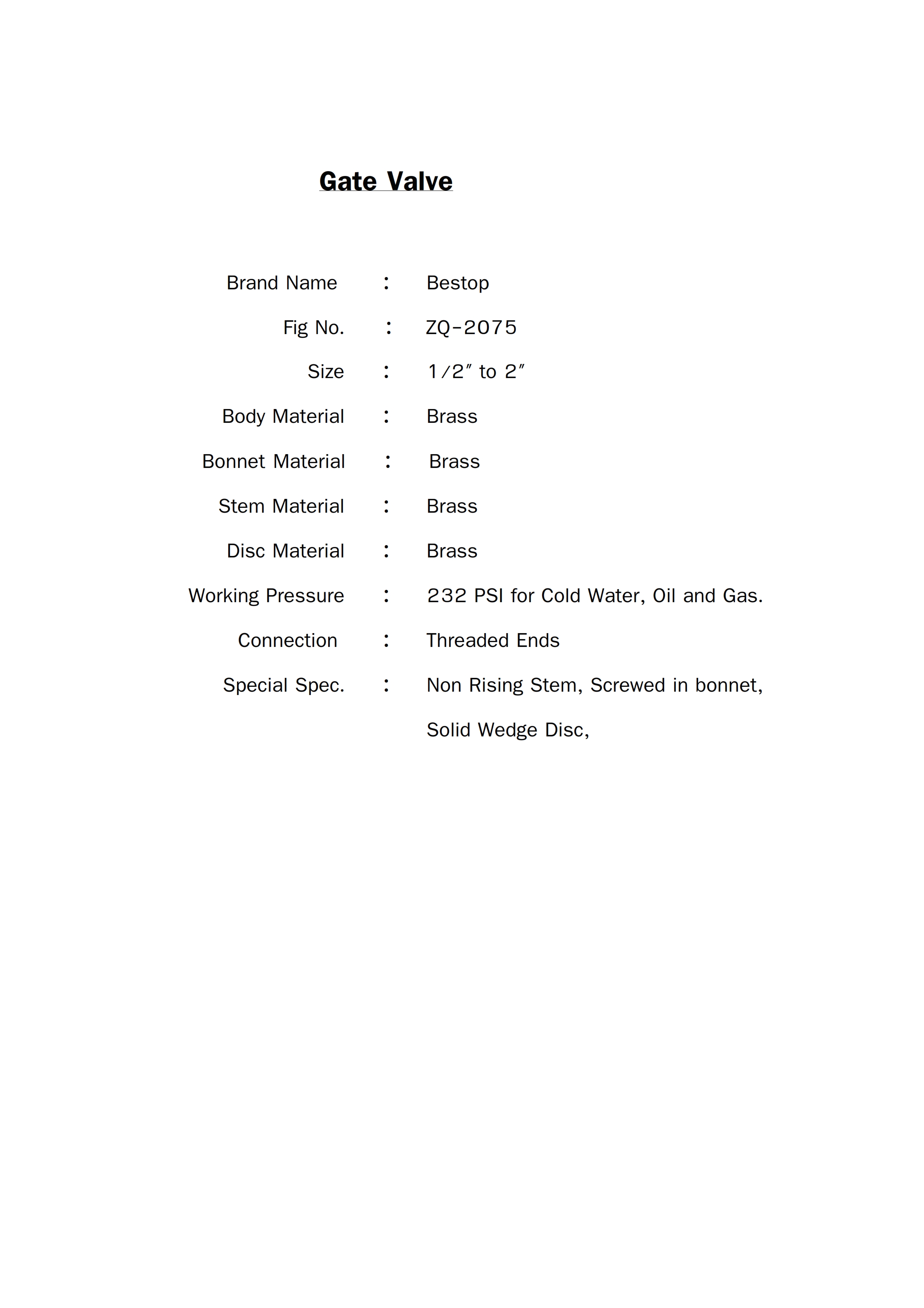 Bestop Brass Gate Valve, Class PN16 Model : ZQ-2075